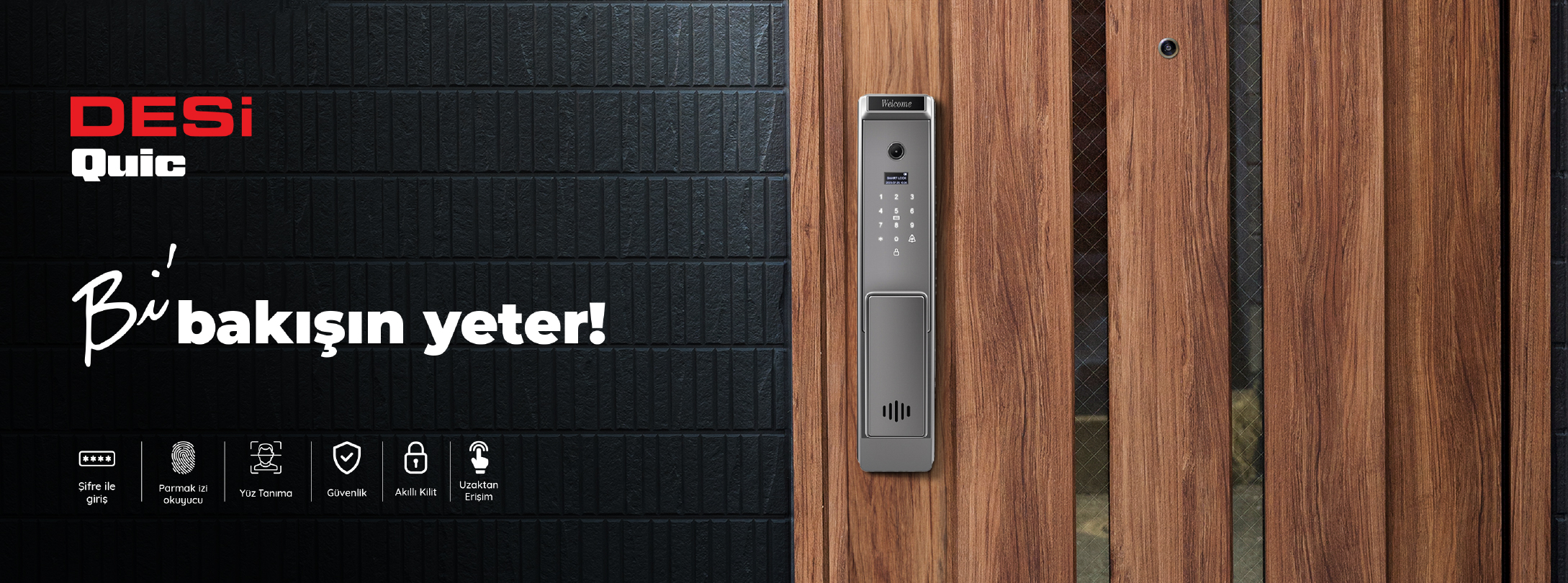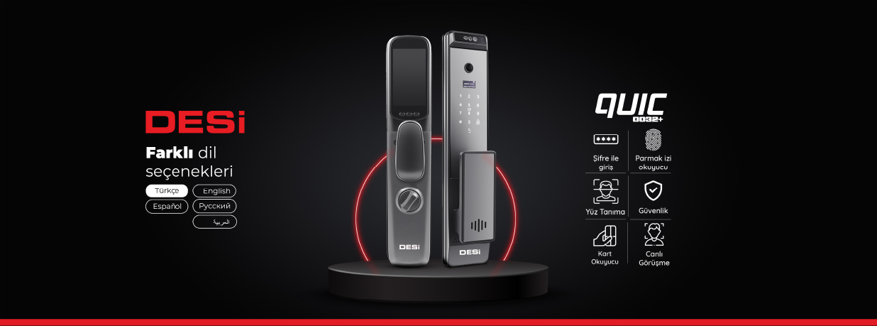 DESi Quic akıllı kilit ile kapınızı yüz tanıma, parmak izi, kart, şifre ile açabilir ve kilitleyebilirsiniz. Dahili Wi-Fi sistemi sayesinde kapınızdaki misafiriniz ile video görüşmesi yapabilirsiniz.